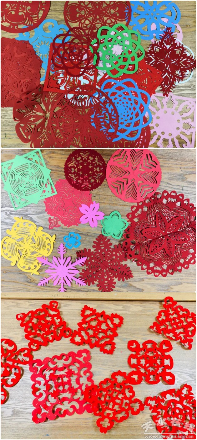 一幅幅具有團(tuán)團(tuán)圓圓、幸福美滿、富貴吉祥等寓意的團(tuán)花、雪花、拉花不斷涌現(xiàn)在剪刀之下,平凡的紙張?jiān)诤⒆觽兊闹讣鉄òl(fā)出別樣的風(fēng)采。
