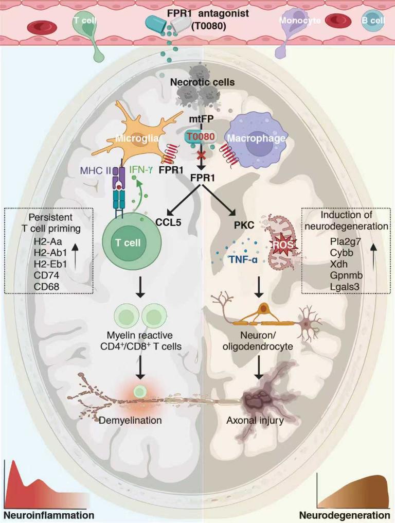 針對這一長期困擾醫(yī)學(xué)界的難題,施福東課題組經(jīng)過多年攻關(guān),闡明受損細(xì)胞釋放的線粒體甲酰肽可通過激活FPR1,驅(qū)動(dòng)腦內(nèi)炎癥區(qū)域化進(jìn)展并誘發(fā)神經(jīng)退行的雙通路病理機(jī)制。