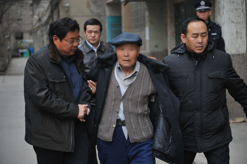 15時(shí)57分,一個(gè)面色憔悴,手腳發(fā)麻的老人在兩名干警的攙扶下出現(xiàn)在居民樓拐角處。