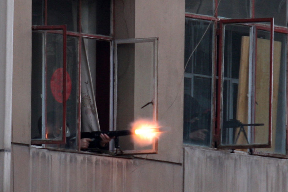 19時(shí)45分,戴著防毒面具的特警開始拿著破門工具再次發(fā)起攻勢。