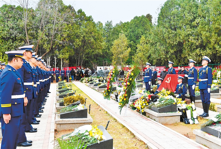 早晨10時(shí),來自蘭州市消防救援支隊(duì)的百余名消防官兵,整齊排列。哀樂奏起,他們頷首肅立、默哀一分鐘。隨之,花籃被莊嚴(yán)抬上前來,端正擺放于陳紅軍烈士墓碑兩側(cè),全體消防官兵依次排隊(duì)獻(xiàn)花,最后行鞠躬禮。