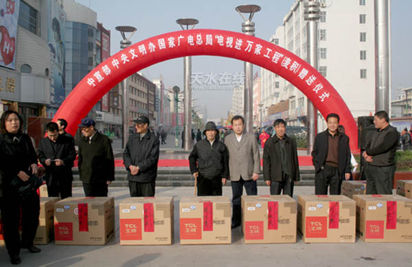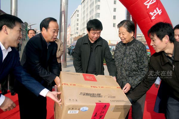 11月10日,麥積區(qū)隆重舉行“電視進(jìn)萬(wàn)家工程”贈(zèng)送儀式,現(xiàn)場(chǎng)免費(fèi)將120臺(tái)21 英寸彩色電視機(jī)贈(zèng)送給健在的老紅軍、老紅軍遺屬、老八路以及當(dāng)年紅二十五軍長(zhǎng)征途經(jīng)該區(qū) 8鄉(xiāng)鎮(zhèn)37村的部分特困農(nóng)戶和在該區(qū)長(zhǎng)期從事未成年人思想道德建設(shè)工作、成績(jī)顯著,但家庭比較貧寒的老干部、老戰(zhàn)士、老專家、老模范、老教師等“五老”手中。