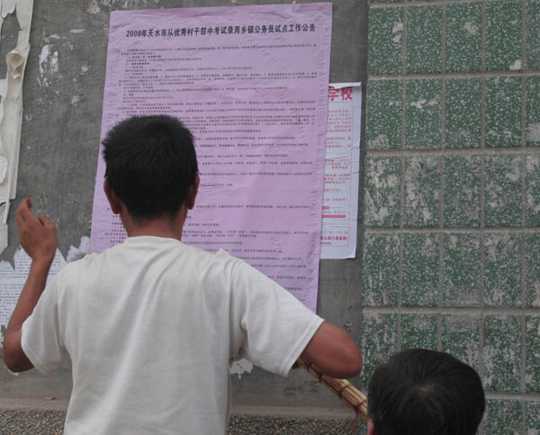 經(jīng)省委組織部、省人事廳研究決定,麥積區(qū)將開展從全區(qū)優(yōu)秀村干部中考試錄用鄉(xiāng)鎮(zhèn)公務(wù)員試點(diǎn)工作。7月31日上午,麥積區(qū)專門召開全區(qū)從優(yōu)秀村干部中考錄鄉(xiāng)鎮(zhèn)公務(wù)員試點(diǎn)工作動(dòng)員大會(huì),明確了考錄試點(diǎn)工作的意義及考錄原則、范圍、報(bào)考條件和工作程序等,并就全區(qū)做好考錄試點(diǎn)工作作了具體安排。8月1日,全區(qū)各鄉(xiāng)鎮(zhèn)積極行動(dòng),廣泛宣傳,及時(shí)召開各鄉(xiāng)鎮(zhèn)從優(yōu)秀村干部中考錄鄉(xiāng)鎮(zhèn)公務(wù)員試點(diǎn)工作動(dòng)員大會(huì),并組織鄉(xiāng)鎮(zhèn)干部深入各村散發(fā)張貼《2008年天水市從優(yōu)秀村干部中考試錄用鄉(xiāng)鎮(zhèn)公務(wù)員試點(diǎn)工作公告》,將有關(guān)優(yōu)秀村干部考錄鄉(xiāng)鎮(zhèn)公務(wù)員試點(diǎn)工作的事項(xiàng)和精神宣傳到每一位村民。