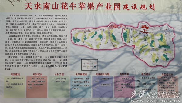 另悉,麥積區(qū)委、區(qū)政府高度重視“一城兩園”建設工作,將其列為了全區(qū)工作的重中之重,認真開展了“一城兩園”建設前期工作,目前,各項工作正在扎實有效推進:一是規(guī)劃工作基本就緒。委托同濟大學正在按照相關意見編制中國天水花牛蘋果商貿(mào)城的規(guī)劃;兩園總體規(guī)劃和產(chǎn)業(yè)發(fā)展、生態(tài)建設、上水工程、道路建設、高效農(nóng)業(yè)、旅游發(fā)展等專項規(guī)劃及北山核心區(qū)規(guī)劃討論稿已經(jīng)完成,正在征求有關方面意見。二是花牛蘋果商貿(mào)城征地工作穩(wěn)步開展。申請了花牛蘋果商貿(mào)城建設項目選址意見書和建設用地規(guī)劃許可證,完成了建設用地勘界測繪和征地拆遷摸底調(diào)查工作。三是“兩園”項目建設進展順利。自啟動實施“兩園”項目以來,新建果園2.9萬多畝;北山生態(tài)產(chǎn)業(yè)示范園完成生態(tài)林建設970畝,栽植刺槐32萬余株,新修8米寬4.5公里道路一條;南山花牛蘋果產(chǎn)業(yè)園區(qū)完成硬化道路13.6公里,完成土地整理3.2萬畝,新修產(chǎn)業(yè)區(qū)道路125.3公里。四是土地流轉(zhuǎn)步伐加快。加大宣傳推介,在南山花牛蘋果產(chǎn)業(yè)園甘泉等鄉(xiāng)鎮(zhèn)流轉(zhuǎn)土地2257畝;與天水花牛蘋果集團、天水嘉園果蔬有限公司、天水中澤農(nóng)業(yè)高新科技有限公司、天水威龍有限公司等企業(yè)初步達成了投資“兩園”建設的意向。