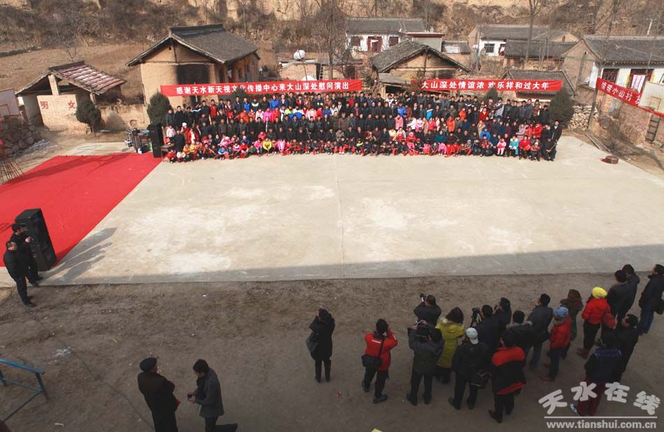 天水市麥積區(qū)三岔鄉(xiāng)佘家門村春節(jié)第一次迎來慰問演出團(tuán)并拍下全村史上首張村民合影
