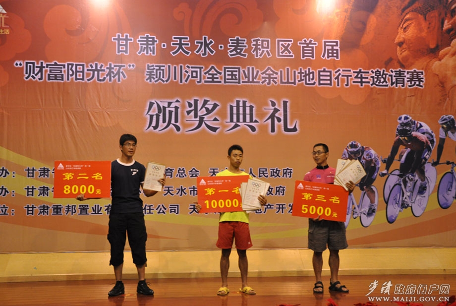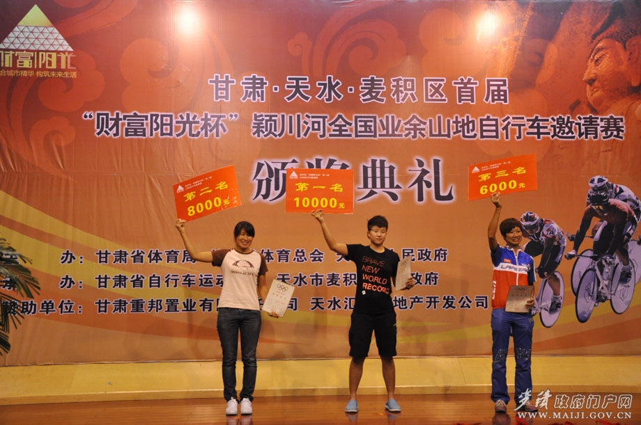 (省自行車協(xié)會(huì)秘書長(zhǎng)謝成杰、甘肅重邦置業(yè)有限公司總經(jīng)理裴仰忠為女子組前三名頒獎(jiǎng))