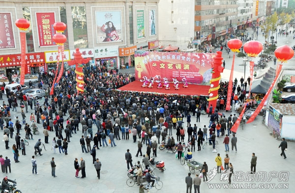為了進(jìn)一步鼓舞人心,凝聚力量,唱響主旋律,喜迎黨的十八大勝利召開。10月30日至31日,由麥積區(qū)委宣傳部主辦,區(qū)文化廣播影視局承辦的麥積區(qū)喜迎黨的十八大文藝調(diào)演活動(dòng)在商埠路步行街隆重舉行。