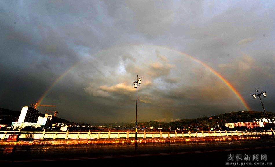 6月9日傍晚時(shí)分,麥積區(qū)城區(qū)一場突如其來的狂風(fēng)暴雨之后,天空中出現(xiàn)一道彩虹,它是一道橫跨天空的七色彩帶,紅、橙、黃、綠、青、藍(lán)、紫,宛如一座彩色的拱橋飛架渭河兩岸,氣勢恢宏,蔚為壯觀,吸引好多路人駐足拍照留影。