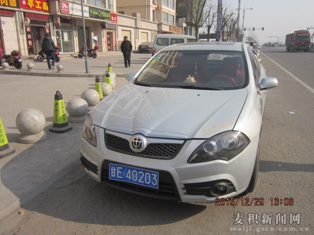 ▲甘E40203于2015年12月29日13時(shí)08分在麥積區(qū)中心大道違法停放,依據(jù)《道路交通安全法》第93條第2款、《甘肅省道路交通安全條例》第82條第10項(xiàng)之規(guī)定處100元罰款。