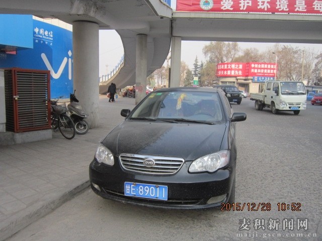 ▲甘E89011于2015年12月28日10時(shí)52分在麥積區(qū)盤旋路違法停放,依據(jù)《道路交通安全法》第93條第2款、《甘肅省道路交通安全條例》第82條第10項(xiàng)之規(guī)定處100元罰款。