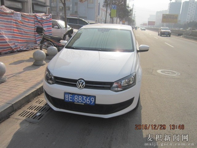 ▲甘E88369于2015年12月29日13時(shí)48分在麥積區(qū)埠南路違法停放,依據(jù)《道路交通安全法》第93條第2款、《甘肅省道路交通安全條例》第82條第10項(xiàng)之規(guī)定處100元罰款。