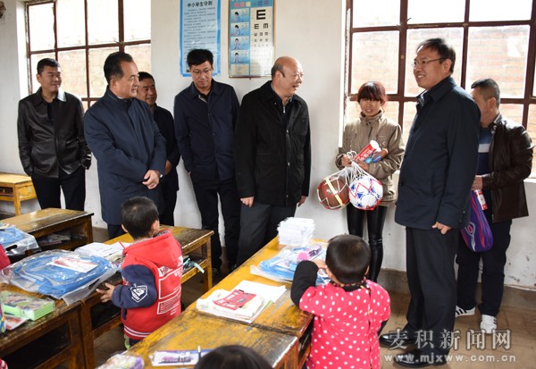 在石佛鎮(zhèn)馬家山村,調(diào)研組查看了馬家山村陣地建設(shè)和扶貧攻堅作戰(zhàn)圖,詳細了解了石佛鎮(zhèn)扶貧戰(zhàn)略部署、富民產(chǎn)業(yè)、民生事業(yè)和“三戶一孤”大病救助保險項目實施情況。在陶崖村,調(diào)研組看望慰問陶崖村小學(xué)師生,為他們贈送了書法作品和學(xué)習(xí)用具,并鼓勵同學(xué)們好好學(xué)習(xí),靠知識改變命運建設(shè)自己美麗家鄉(xiāng)。在貧困戶陶倉恩家中,唐華東與他們拉家常、話發(fā)展,仔細詢問和了解家庭成員、主要經(jīng)濟收入來源,為他贈送了書法作品并鼓勵他要堅定信心、找對致富門路,發(fā)展好農(nóng)業(yè)種植,依靠辛勤勞動早日擺脫貧困,過上更加美好的幸福生活。在麥積鎮(zhèn)紅崖村,調(diào)研組參觀了央視一套熱播劇《苦樂村官》拍攝基地,詳細了解了紅崖村基礎(chǔ)設(shè)施建設(shè)、富民產(chǎn)業(yè)培育、公共服務(wù)保障、旅游業(yè)發(fā)展等情況。