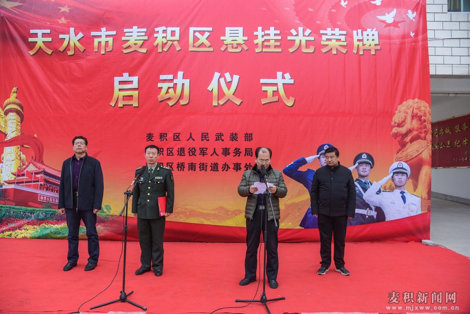 為了認(rèn)真貫徹落實國務(wù)院為烈屬、軍屬和退役軍人等家庭懸掛光榮牌的政策精神,3月7日上午,麥積區(qū)懸掛光榮牌啟動儀式在橋南街道辦事處天河社區(qū)舉行。