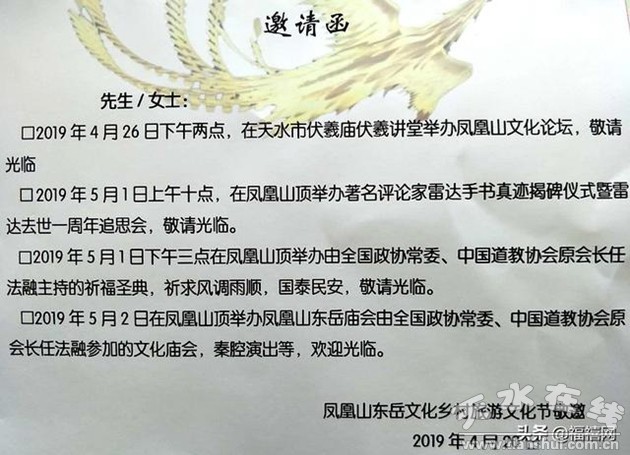 首屆鳳凰山東岳文化鄉(xiāng)村旅游節(jié)的具體活動(dòng)內(nèi)容有:4月26日下午,在天水市博物館暢和軒(伏羲廟伏羲講堂)舉辦“秦州鎮(zhèn)岳,祈福圣地”鳳凰山史地文化文明探源研討會(huì);5月1日上午,在鳳凰山舉辦著名文學(xué)評(píng)論家雷達(dá),為故鄉(xiāng)題寫的“故鄉(xiāng)山川永在游子心中”書法石碑揭碑儀式、召開雷達(dá)先生逝世一周年追思會(huì);5月1日下午,在鳳凰山舉辦由全國政協(xié)常委、中國道教協(xié)會(huì)原會(huì)長任法融領(lǐng)銜的鳳凰山祈福圣典;4月30日下午開始,在鳳凰山廣場(chǎng)大舞臺(tái)由陜西省周至縣劇團(tuán),連續(xù)演出3天,共6場(chǎng)的秦腔;4月26日至5月2日,在鳳凰山舉辦東岳文化鄉(xiāng)村旅游活動(dòng)。