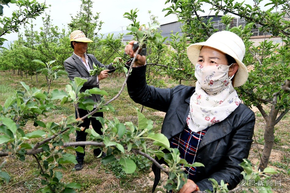 麥積區(qū)融媒體中心訊(特約記者 竇耀輝)5月4日,天水南田生態(tài)農(nóng)業(yè)開發(fā)有限公司工作人員正在麥積區(qū)馬跑泉鎮(zhèn)王家沽沱村蘋果園指導果農(nóng)為花牛蘋果疏果,為秋季蘋果豐產(chǎn)增收打好基礎(chǔ)。該公司充分發(fā)揮企業(yè)優(yōu)勢,組織工作人員走入果農(nóng)家庭、果園深處,以每畝預付1000元定金的方式調(diào)動果農(nóng)作物蘋果,讓果農(nóng)吃上了“定心丸”。