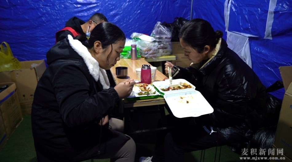 連日來,高強度的核酸檢測采樣工作,讓醫(yī)護人員、警察、社區(qū)工作人員和志愿者相當辛苦,他們晝夜堅守,經(jīng)常是換班下來稍作調整又立馬回到自己的崗位。記者在現(xiàn)場看到,都已經(jīng)晚上十點了,防疫工作人員才開始新一輪的換班吃飯,而吃飯的地方僅僅是一張臨時搭建的簡易桌,剛換班的防疫工作人員吃著早已涼透的晚餐,他們的臉上掛著疲憊的笑容。雖然一天冷餓交替,精疲力盡,但他們一絲不茍,勇往前行,無懼無畏,毅然堅守在自己的崗位,奉獻著自己的力量。