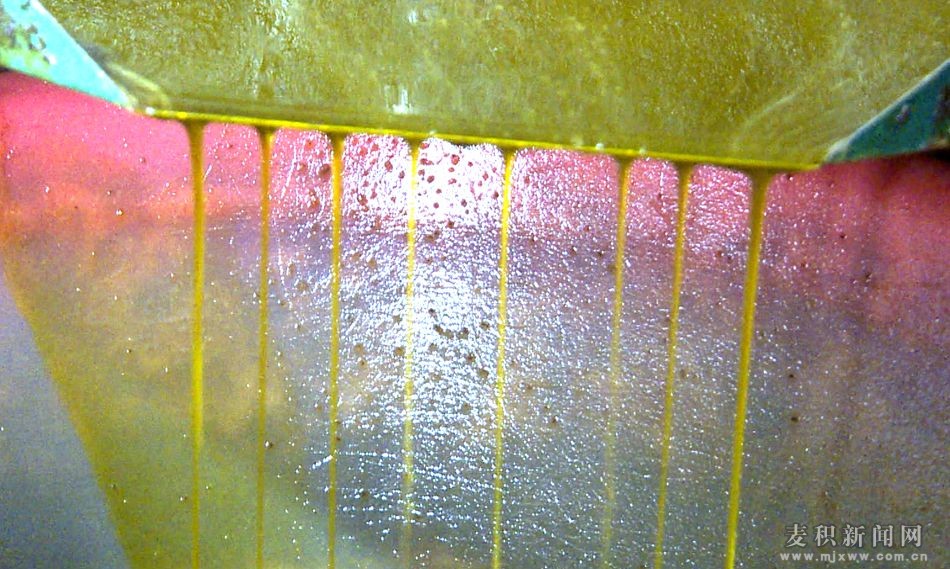 走進(jìn)榨油坊,隆隆的機(jī)器聲傳入耳中。油坊師傅的操作熟練快捷,榨油師傅麻利地將菜籽用鐵鍬撥入機(jī)器倒進(jìn)榨油機(jī)里,隨著機(jī)器的運(yùn)行,不一會(huì)兒,榨過油的菜籽被機(jī)器壓扁,變成了一塊塊油枯,再經(jīng)過長(zhǎng)長(zhǎng)的管道一系列的操作,另一端一縷縷細(xì)細(xì)菜籽油便從油槽里慢慢地滴落下來。據(jù)油坊負(fù)責(zé)人介紹,第一次出來泛著奶黃色泡沫的黃褐色菜籽油遠(yuǎn)遠(yuǎn)不夠清澈,還需要提至另一臺(tái)過濾機(jī)進(jìn)行二次過濾,這時(shí)候出來的油就是澄亮澄亮的金黃色,用油桶裝好就可以提回家了。