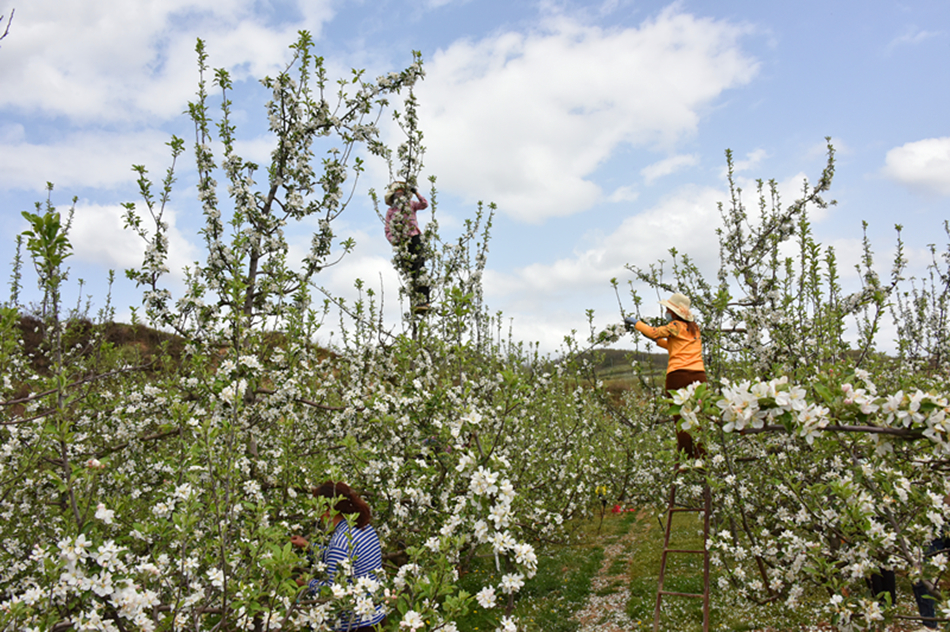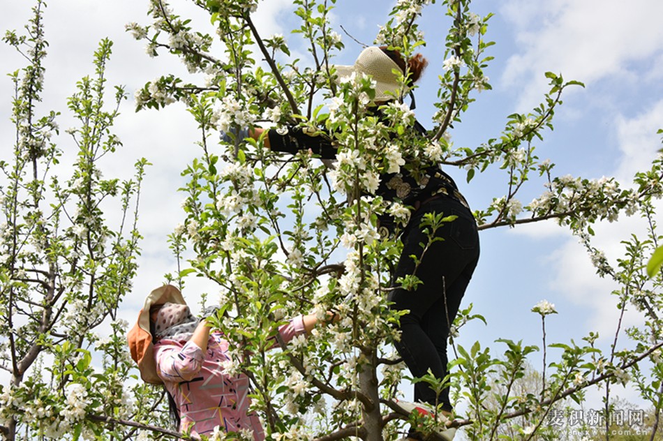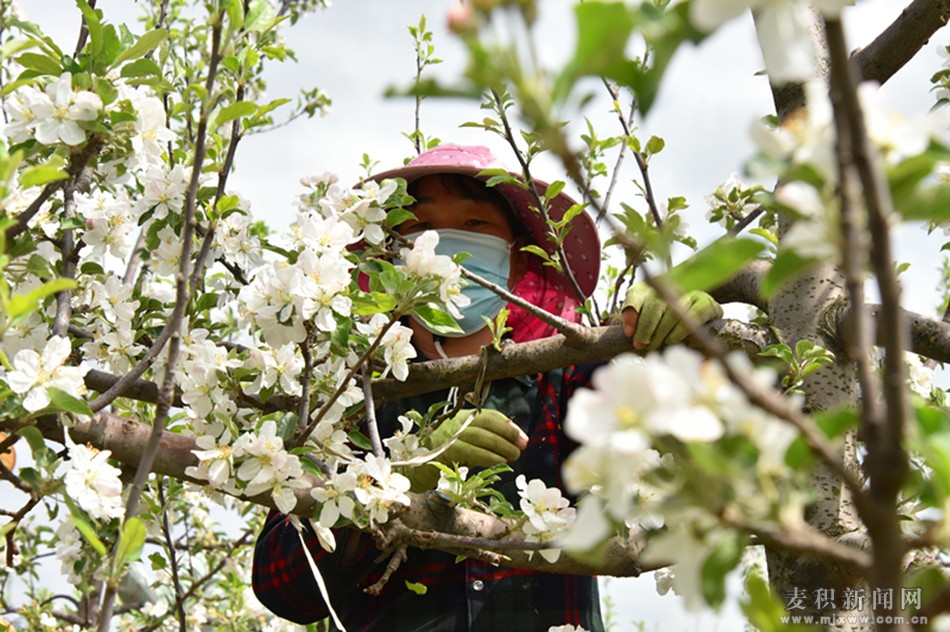 麥積區(qū)融媒體中心訊(記者 姚苗 王雯 何彤彤)俗話說:“花期不疏花,樹枝掛果也白搭!苯,隨著氣溫的逐漸回升,蘋果花競相開放,在麥積鎮(zhèn)的果園里,果農(nóng)們緊抓時機,忙著給果樹疏花,呈現(xiàn)出一派生機勃勃的景象。