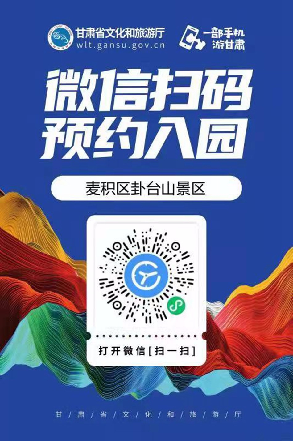 景區(qū)嚴(yán)格落實“限量、預(yù)約、錯峰”要求,請廣大游客朋友通過甘肅省文化和旅游廳一部手機游甘肅APP或掃描預(yù)約碼預(yù)約,經(jīng)核驗無誤后方可進(jìn)入景區(qū)參觀。
