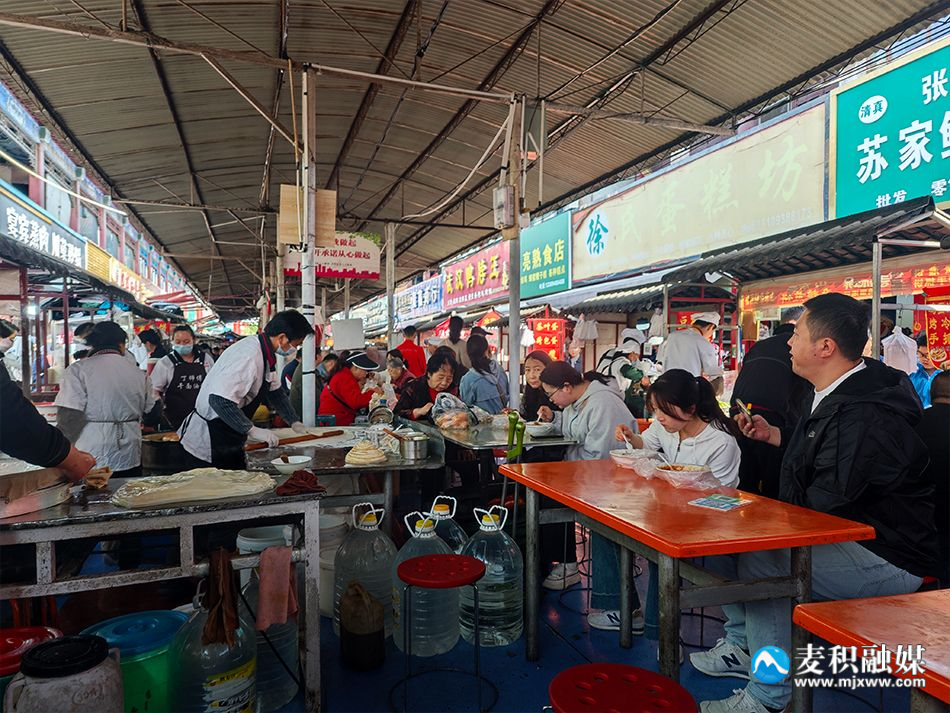 5月1日清晨六點(diǎn)多,麥積區(qū)的仿古街市場已是一片熱鬧。熱氣騰騰的豆腐腦驅(qū)散了清晨的寒意,包子鋪里飄出的香氣令人陶醉。金黃酥脆的醬香餅、本地特色的呱呱和豬油盒子等美食,都在等待著食客的到來。在霧氣騰騰的早餐攤和鄰里間的問候聲中,點(diǎn)上一份心儀的早餐,細(xì)細(xì)品味,這一天的幸福便由此開始。