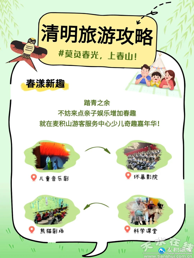 4.未到時間段的游客可在麥積山游客服務中心稍作休息,游客服務中心設有數(shù)字電影院、文化創(chuàng)意館、少兒奇趣嘉年華,供您觀影、休息、娛樂、購物。