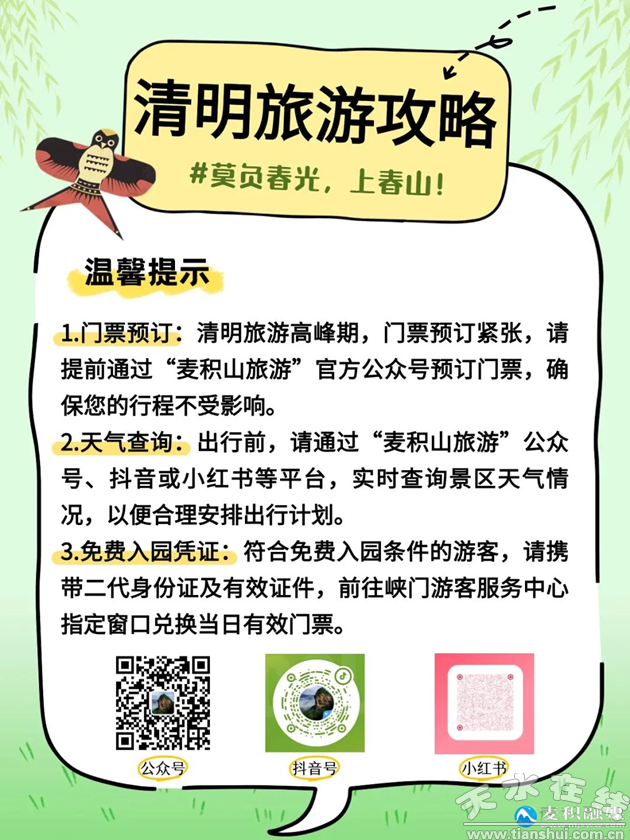 1.景區(qū)實行“分時段預約、分時段檢票、分時段入園”的預約接待模式。請廣大的游客關注“麥積山旅游”公眾號提前做好門票預約,規(guī)劃好行程。