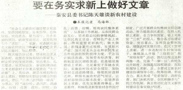 陳天雄告訴記者,建設(shè)社會(huì)主義新農(nóng)村,就要在掌握縣情的基礎(chǔ)上,樹(shù)立科學(xué)的發(fā)展思路,突出重點(diǎn),扎實(shí)推進(jìn)。從實(shí)際出發(fā),秦安的建設(shè)社會(huì)主義新農(nóng)村工作重點(diǎn)要放在“七個(gè)求新”上,具體講,就是在規(guī)劃和示范上求新,積極探索新農(nóng)村建設(shè)的新模式,要以“三清三改四治一提高”為重點(diǎn),即“清垃圾,清污泥、清路障,改廁、改圈,改灶,治臟、治亂、治愚、治懶,提高農(nóng)民整體素質(zhì)”,從基礎(chǔ)工作抓起,從農(nóng)民群眾最關(guān)心、要求最迫切的事情抓起,讓農(nóng)民真正受益;在特色產(chǎn)業(yè)上求新,林果業(yè)要更新?lián)Q代,做大做強(qiáng),養(yǎng)殖業(yè)要形成規(guī)模,發(fā)展新興產(chǎn)業(yè),加大對(duì)龍頭企業(yè)和農(nóng)民專(zhuān)業(yè)合作經(jīng)濟(jì)組織的扶持力度,千方百計(jì)搞活流通,發(fā)展勞務(wù)經(jīng)濟(jì)等,積極拓寬農(nóng)民增收渠道;在基礎(chǔ)設(shè)施建設(shè)上求新,立足秦安干旱缺水實(shí)際,實(shí)施農(nóng)村飲水安全項(xiàng)目,加快農(nóng)村交通道路建設(shè),繼續(xù)抓好退耕還林,積極實(shí)施農(nóng)村沼氣項(xiàng)目,讓農(nóng)村面貌得以根本改變;在培養(yǎng)農(nóng)民上求新,優(yōu)先發(fā)展教育事業(yè)、職業(yè)教育,積極推進(jìn)新型農(nóng)村合作醫(yī)療制度,廣泛開(kāi)展群眾性精神文明創(chuàng)建活動(dòng),努力提高農(nóng)民素質(zhì);在投入機(jī)制上求新,全力爭(zhēng)取國(guó)家、省上對(duì)秦安“三農(nóng)”的投入,整合各方面建設(shè)資金,突出重點(diǎn),發(fā)揮資金整體效益,增強(qiáng)農(nóng)村發(fā)展后勁,在民主管理上求新,進(jìn)一步選配好鄉(xiāng)村領(lǐng)導(dǎo)班子,繼續(xù)深入開(kāi)展“三級(jí)聯(lián)創(chuàng)”和“雙培雙帶”活動(dòng),推行公推直選和兩推一選,完善 “一事一議”和村務(wù)公開(kāi)制度,加強(qiáng)基層政權(quán)建設(shè);在組織領(lǐng)導(dǎo)上求新,縣、鄉(xiāng)要成立新農(nóng)村建設(shè)協(xié)調(diào)領(lǐng)導(dǎo)小組,統(tǒng)籌協(xié)調(diào),形成合力,真正形成“黨委領(lǐng)導(dǎo)、政府負(fù)責(zé)、部門(mén)齊抓共管、全民積極參與”的工作機(jī)制,真正推動(dòng)社會(huì)主義新農(nóng)村建設(shè)在秦安穩(wěn)步前進(jìn)。