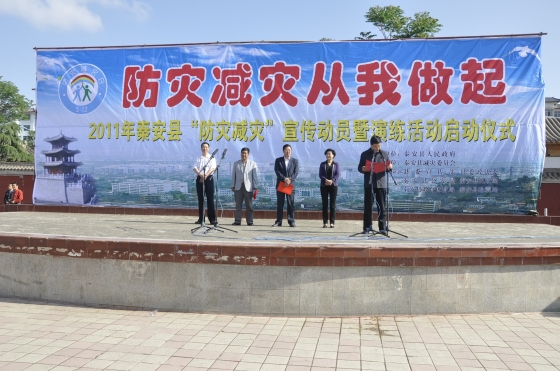 5月12日,由秦安縣人民政府、縣減災(zāi)委員會主辦的全縣防災(zāi)減災(zāi)宣傳動員暨演練活動在興國文化廣場舉行,標(biāo)志著以“防災(zāi)減災(zāi)從我做起”為主題的防災(zāi)減災(zāi)活動正式啟動。縣委副書記、縣長王東紅,縣委常委、政法委書記車學(xué)軍,縣人大副主任劉小秦,副縣長魏世中,縣政協(xié)副主席王小平出席啟動儀式?h委宣傳部、政法委、民政局、地震局、發(fā)改局、五中、三小等單位的干部職工和學(xué)生參加活動儀式。