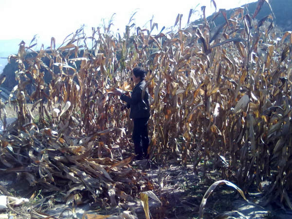 “去年我種的3.5畝小麥,精耕細(xì)作辛苦一年,可一畝地才打了400斤過一點(diǎn)。去年麥?zhǔn)蘸,鄉(xiāng)上調(diào)整種植結(jié)構(gòu),在臥牛坪推廣全膜玉米,說畝產(chǎn)要在1500斤左右。這產(chǎn)量在水川地上我們聽說過,可是到這山上誰也不敢相信,所以大家都抱著嘗試的態(tài)度,響應(yīng)了政府的號(hào)召,種上了全膜玉米,有個(gè)別兩三戶不相信,還是種植了小麥,不成想,今年旱情嚴(yán)重,普通小麥只有尺把長,一畝地只產(chǎn)300斤左右——玉米就不同了,長勢一直很好,都是雙棒,穗大粒滿,一家人掰了七八天,整整裝了8車,畝產(chǎn)可達(dá)1600斤,頂幾畝麥子的收入!彼握谆⒌脑洪T處停著一輛中型藍(lán)色時(shí)風(fēng)三輪車,半車未卸載的玉米和車體上迎風(fēng)晃動(dòng)著的玉米須,向我們展示著豐收的喜悅。