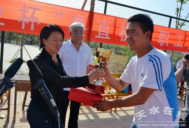 縣人大常委會(huì)副主任魏千乙為獲得亞軍的文化衛(wèi)生系統(tǒng)代表隊(duì)頒獎(jiǎng)