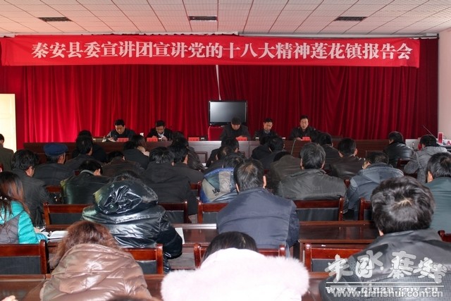 為深入學(xué)習(xí)宣傳貫徹黨的十八大精神,更好把廣大黨員和干部群眾的思想統(tǒng)一到黨的十八大精神上來,12月14日,秦安縣委宣講團(tuán)深入蓮花鎮(zhèn),宣講黨的十八大精神。蓮花鎮(zhèn)全體干部、各村支部書記、鎮(zhèn)屬各單位負(fù)責(zé)人共210余人參加了宣講會(huì)。
