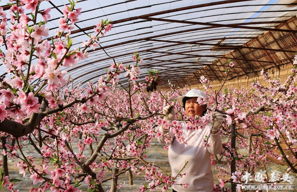 1月20日,筆者來到秦安縣興國鎮(zhèn)依仁村的設(shè)施農(nóng)業(yè)基地看到,這里四十多個(gè)日光溫室大棚并排而立,在陽光的照射下,顯得格外注目。一進(jìn)溫棚,眼前就像浮著一片粉紅的云彩,朵朵桃花嬌艷可人,片片桃花競相綻放,在枝頭嫩綠葉芽的映襯下,顯得更加美麗,仿佛進(jìn)入花的海洋,大棚里處處彌漫著春的氣息。