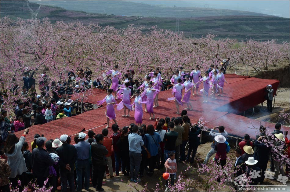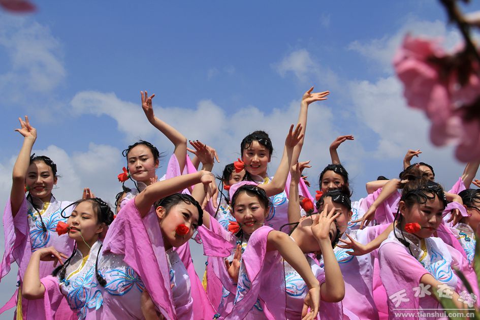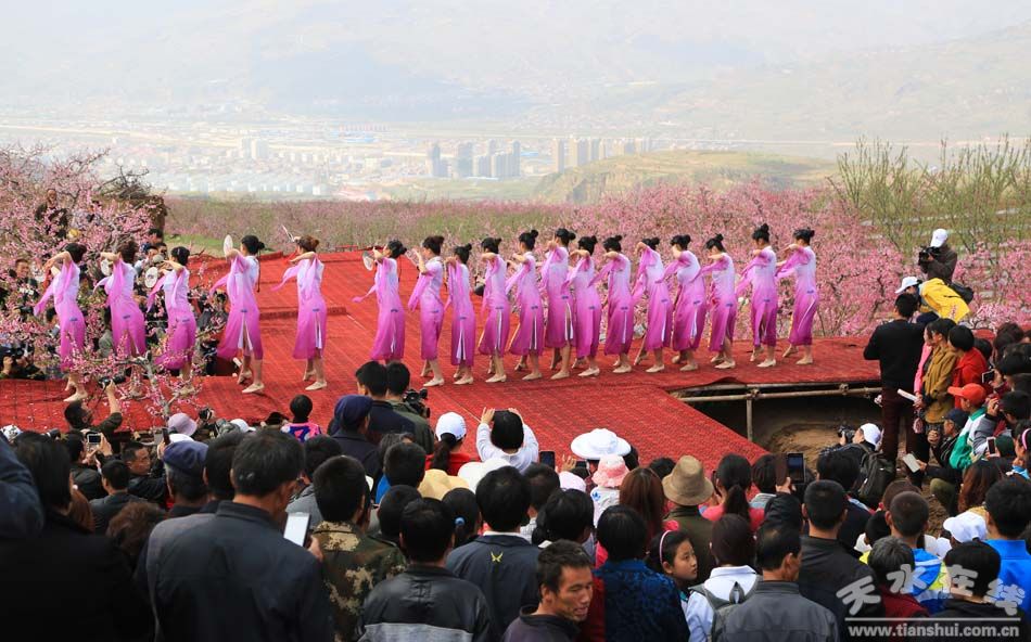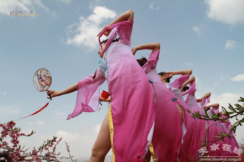 (天水市歌舞團(tuán)演員在“中國美麗田園·秦安何灣桃花景觀”演出舞蹈:《秀色》)