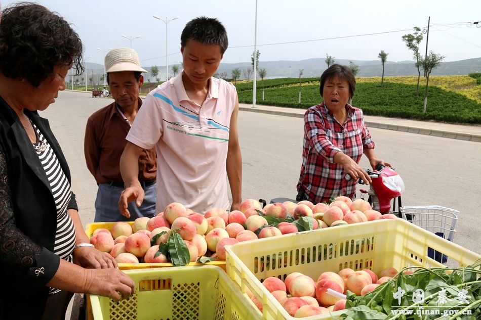 盛夏七月,置身于秦安桃園,每當(dāng)微風(fēng)拂過(guò)樹(shù)梢,一股甜絲絲的清香味在不經(jīng)意間向你襲來(lái)。在路邊零星擺設(shè)的攤位上,一顆顆白里透紅的蜜桃更散發(fā)著誘人的氣息,吸引著來(lái)往的人群。不算太寬的鄉(xiāng)間道路上,總有一些人停下車子,來(lái)到攤前詢問(wèn)著、品嘗著。果香四溢間,是同樣的滿足而幸福的笑顏。