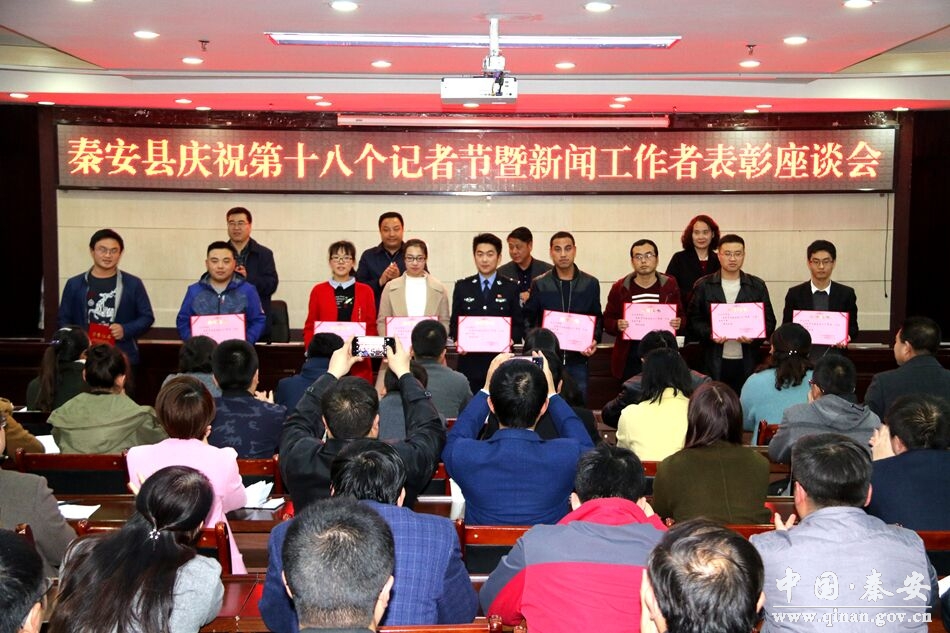 11月9日,秦安縣召開慶祝第十八個(gè)記者節(jié)暨新聞工作者表彰座談會,縣委常委、宣傳部部長徐東明,縣人大常委會副主任張耀清,縣政府副縣長于劍鋒,縣政協(xié)副主席逯虹,縣新聞中心、縣政府信息中心、縣廣播電視臺的新聞工作者,以及來自各鎮(zhèn)、各部門、各單位的宣傳干事共計(jì)120余人參加了會議。