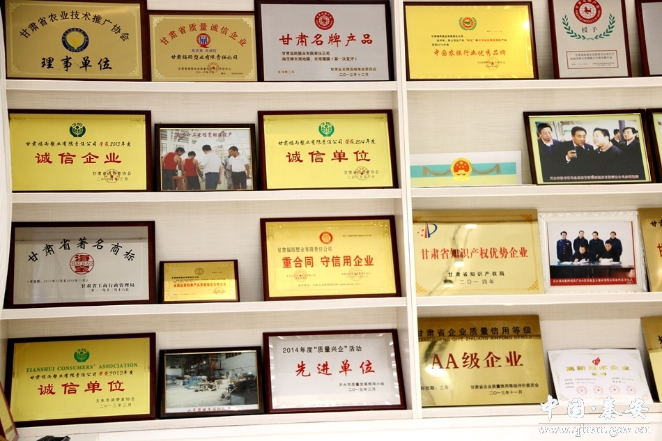 2013年甘肅福雨塑業(yè)有限責任公司被甘肅省質量協(xié)會評為甘肅省企業(yè)質量信用等級評價AA級企業(yè),被甘肅省農(nóng)業(yè)技術推廣協(xié)會評為“甘肅省農(nóng)業(yè)技術推廣協(xié)會理事單位”;2014年12月,甘肅福雨塑業(yè)有限責任公司企業(yè)技術中心被認定為省級認定技術中心、高新技術企業(yè);2016年11月公司被中國塑料加工工業(yè)協(xié)會評為“十二五”塑料加工業(yè)科技創(chuàng)新型企業(yè)、“十二五”期間中國塑料行業(yè)優(yōu)秀企業(yè);公司研發(fā)的“地膜收卷機的膜卷自動搬移設備研制”被評為“十二五”塑料加工業(yè)優(yōu)秀科技成果,公司董事長陳二虎被評為“十二五”期間中國塑料行業(yè)先進個人;被中國輕工聯(lián)合會評為2016年中國輕工業(yè)塑料行業(yè)(農(nóng)用薄膜)十強企業(yè)。目前,公司已成功申報專利14項(其中發(fā)明專利2項,實用新型專利12項)。