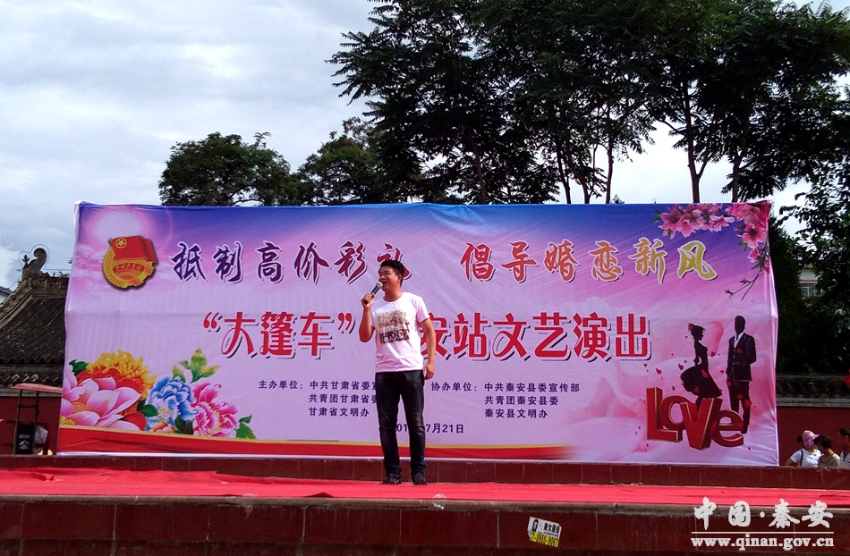為深入貫徹落實習近平新時代中國特色社會主義思想和黨的十九大關于“開展移風易俗 弘揚時代新風行動”的重要部署,推動縣區(qū)有效治理婚嫁彩禮過高問題,7月21日上午,全省“抵制高價彩禮,倡導婚戀新風”大篷車活動在秦安興國文化廣場舉行。