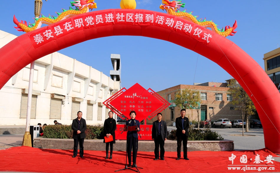 11月2日,秦安縣舉行在職黨員進社區(qū)報到服務活動啟動儀式,動員縣直機關(guān)事業(yè)單位的全體黨員進社區(qū),認領(lǐng)志愿服務崗位,利用業(yè)余時間積極參加社區(qū)活動,為推進社區(qū)黨建與幸福和諧社區(qū)建設作貢獻?h委常委、組織部長肖江,縣人大常委會副主任張耀清,縣委組織部及在職黨員參加了啟動儀式。