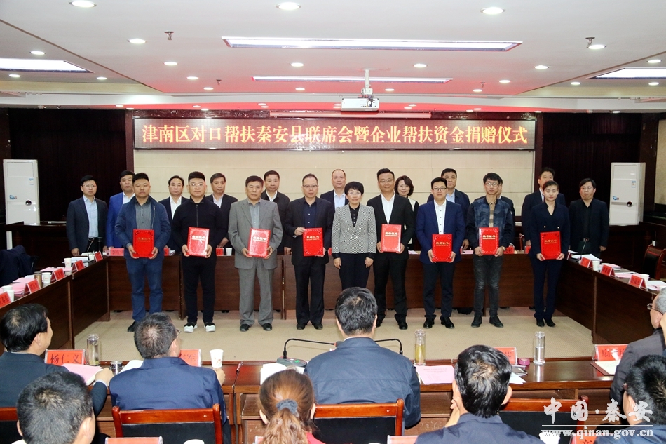 在津南區(qū)對口幫扶秦安縣聯(lián)席會暨企業(yè)幫扶資金捐贈儀式上,縣委副書記、縣長程江芬匯報了2019年東西部扶貧協(xié)作工作開展情況,并為中建方程華北公司、中鐵十八局四公司、津南區(qū)建設(shè)開發(fā)公司、天津易華錄公司等8家向秦安縣捐贈幫扶資金的公司分別頒發(fā)了榮譽證書;津南區(qū)商務(wù)委、工商聯(lián)、統(tǒng)戰(zhàn)部分別介紹了2019年消費扶貧、百企幫百村、社會幫扶計劃;津南區(qū)委副書記、區(qū)長賀亦農(nóng)作了講話,并就津南區(qū)綠色生態(tài)屏障、國家會展中心、“天津智谷”建設(shè)、海河中游南岸高端服務(wù)業(yè)發(fā)展建設(shè),落實小站稻振興計劃等面臨的發(fā)展機遇和發(fā)展形勢向與會者作了簡要介紹;縣委書記王東紅主持聯(lián)席會暨捐贈儀式并就秦安縣情、產(chǎn)業(yè)發(fā)展、旅游資源及精準(zhǔn)扶貧工作等情況作了介紹。