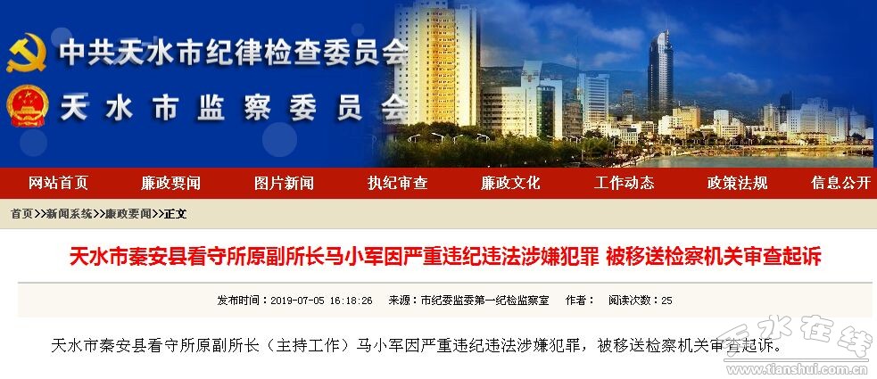 秦安縣看守所原副所長(zhǎng)馬小軍被移送檢察機(jī)關(guān)審查起訴