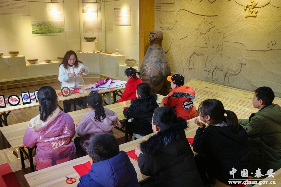 年關(guān)將至,雖然街道上寒風(fēng)瑟瑟,但是在秦安縣博物館里卻是格外的熱鬧。1月14日,這里迎來了一群特殊的客人,非遺剪紙傳承人安梅霞要在這里為學(xué)生們講解剪紙技藝。