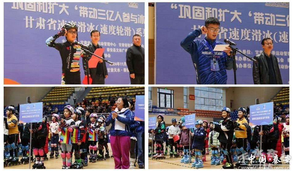 11月23日,“鞏固和擴大‘帶動三億人參與冰雪運動’成果”甘肅省速度滑冰(速度輪滑)系列賽(天水站)在秦安縣體育館開賽。甘肅省冬季運動管理中心副主任吳建軍,秦安縣政府副縣長章春軍參加活動。