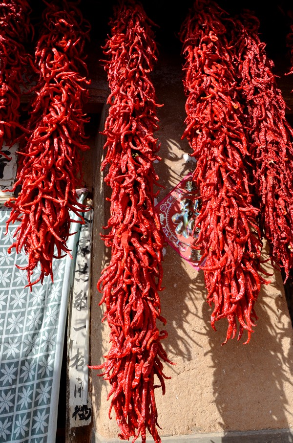 (毛國筆家屋檐下懸掛著火紅的辣椒)