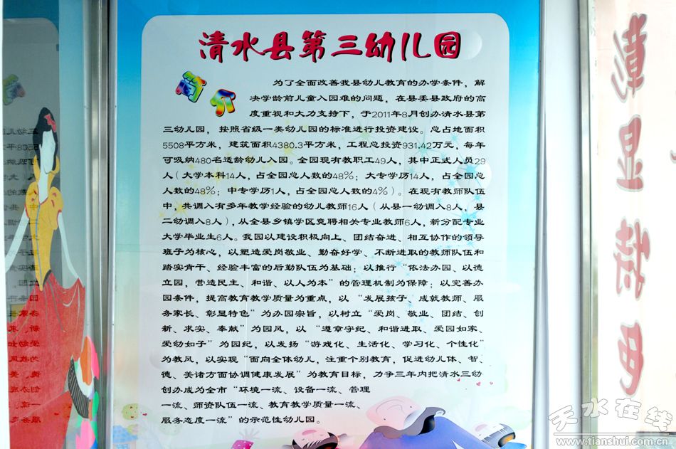 清水縣第三幼兒園于2010年8月立項建設,2011年8月竣工,2012年3月正式投入使用。幼兒園按照省級一類幼兒園標準規(guī)劃建設,工程總投資1460萬元,占地面積5508平方米,建筑面積4380.3平方米,F(xiàn)有教職工58人,其中正式人員28人,教師平均年齡32歲,其中大專以上學歷占96%。設有12個日托教學班,本學期共招收幼兒490名,是目前全縣規(guī)模最大的幼兒園。