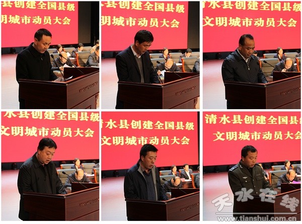 清水縣委書記劉天波出席會議并講話,縣委副書記、縣長馬越垠主持會議,縣委常委、宣傳部長張秀麗宣讀《中共清水縣委清水縣人民政府關(guān)于創(chuàng)建全國縣級文明城市工作實施方案》,縣委政法委、住建局、教體局、工商局、永清鎮(zhèn)等5個部門的負責人和綜合執(zhí)法局干部職工代表做了表態(tài)發(fā)言。