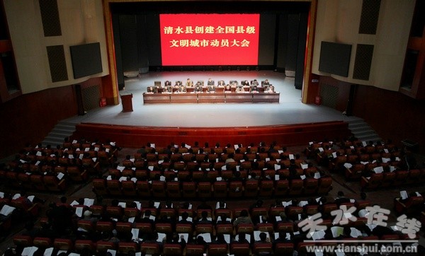 10月29日下午,清水縣在軒轅大劇院隆重召開創(chuàng)建全國縣級文明城市動員大會,按照全國縣級文明城市創(chuàng)建工作現(xiàn)場會議精神的要求,安排部署全縣創(chuàng)建全國縣級文明城市工作。會議號召全縣各級各部門和廣大干部群眾積極行動起來,以積極高昂的創(chuàng)建熱情,決戰(zhàn)必勝的創(chuàng)建決心,求真務實的創(chuàng)建作風,扎實有效的創(chuàng)建舉措,迅速掀起創(chuàng)建工作熱潮,打一場創(chuàng)建文明城市的整體戰(zhàn)、攻堅戰(zhàn),確保清水縣創(chuàng)建全國縣級文明城市工作目標順利實現(xiàn)。