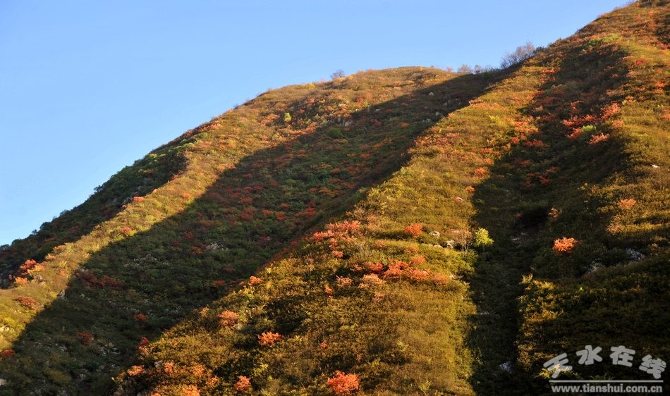 。〞r(shí)值深秋,小泉峽谷漫山五彩斑斕,美麗如畫,在陽(yáng)光的照射下,赤、橙、黃、綠、青、藍(lán)、紫,色彩是那么的悅目、柔和,仿佛是一位油畫家不小心把五彩的顏料灑在了畫布上。) |