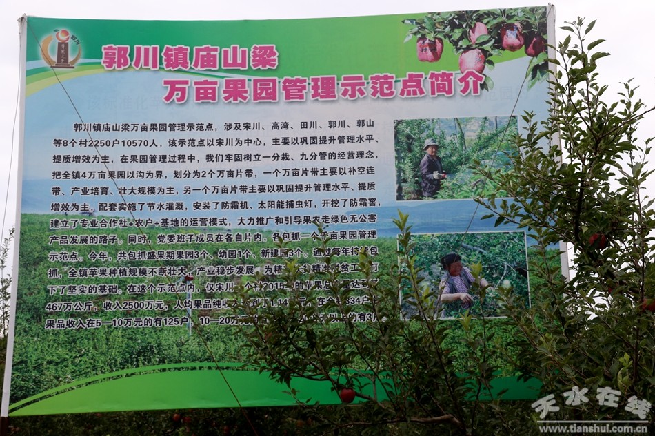 近年來,該鎮(zhèn)緊緊圍繞建設(shè)“蘋果之鎮(zhèn)”目標(biāo),以宋川為龍頭,示范帶動(dòng)全鎮(zhèn)大力發(fā)展蘋果產(chǎn)業(yè),已建成宋川、田川、韓坪、青蓮蘋果產(chǎn)業(yè)帶,石咀、掛丹、趙那蘋果產(chǎn)業(yè)帶,黃大、劉堯、吊灣蘋果產(chǎn)業(yè)帶、郭川、平定、孫山蘋果產(chǎn)業(yè)帶等四個(gè)蘋果產(chǎn)業(yè)帶。創(chuàng)建宋川、郭川、黃大、石咀、韓坪、劉堯六個(gè)千畝標(biāo)準(zhǔn)化管理示范園。全鎮(zhèn)果園總面積達(dá)到36450畝,掛果面積18250畝,品種以紅富士、首紅、俄矮、阿斯、天汪1號(hào)等優(yōu)質(zhì)品種為主,由于果品質(zhì)量好,遠(yuǎn)銷河南、 廣東、山東等省,給果農(nóng)帶來了很好的經(jīng)濟(jì)效益。據(jù)統(tǒng)計(jì)2015年全鎮(zhèn)果品總產(chǎn)量達(dá)2408萬公斤,果品銷售收入達(dá)12400萬元,年人均果品收入5762元,全鎮(zhèn)蘋果收入3-5萬元的有889戶;5-10萬元的有685戶;10-20萬元的有82戶;20萬元以上的有3戶,蘋果產(chǎn)業(yè)已成為郭川鎮(zhèn)廣大群眾增收致富的主導(dǎo)產(chǎn)業(yè)。