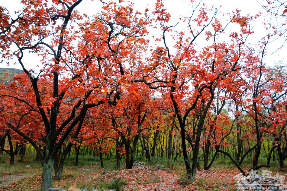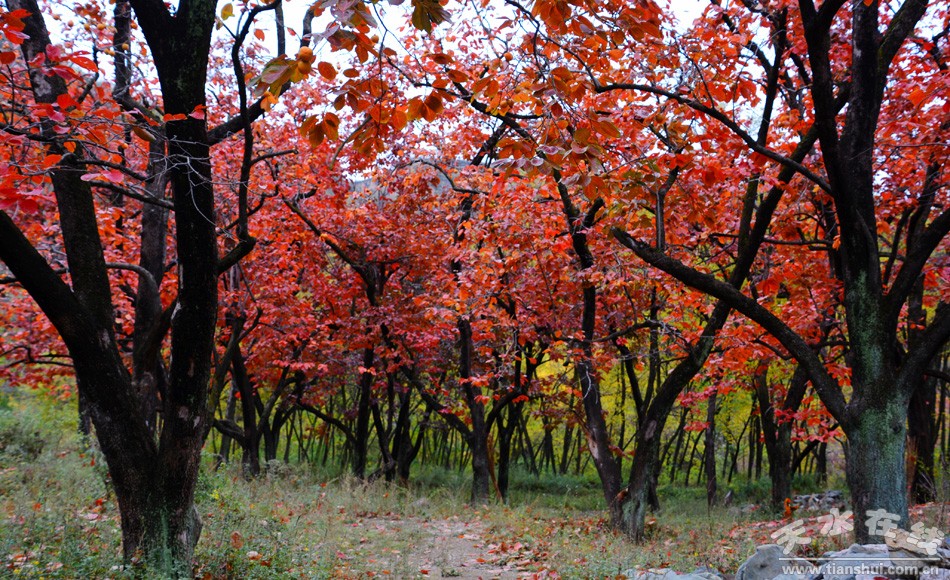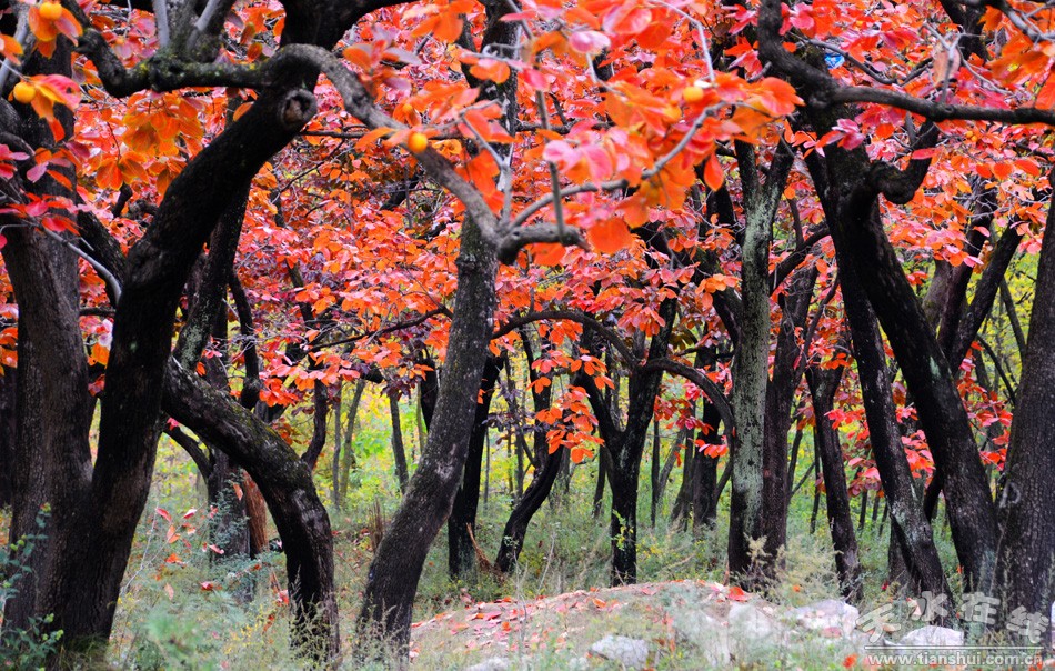 深秋,穿越清水小泉峽谷時(shí),你一定能夠看到一片片火紅的柿子林,在蒼茫的大山深谷間,格外引人注目,一片片柿子葉好像一面面小國(guó)旗,掛在枝頭向來(lái)人招展。不由人想到一首古詩(shī)中改編的一句“停車坐愛(ài)柿林晚,霜葉紅于二月花”。