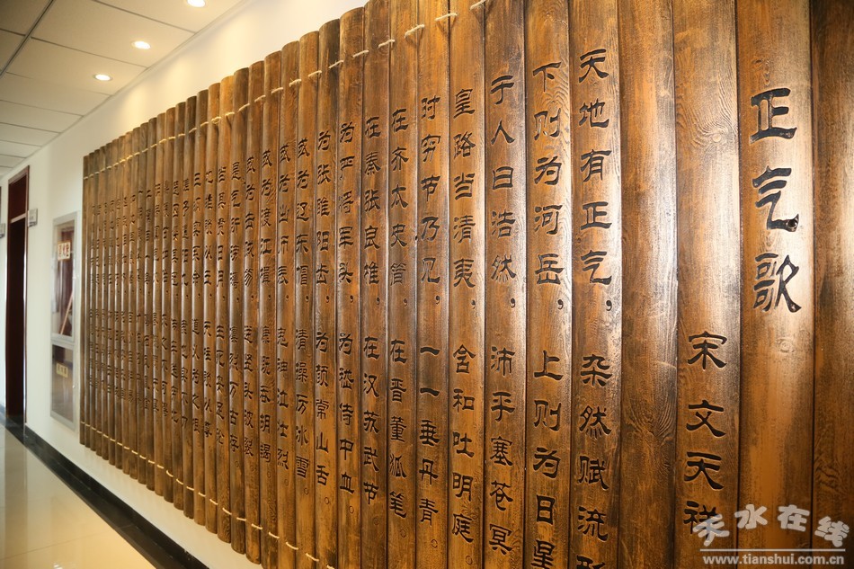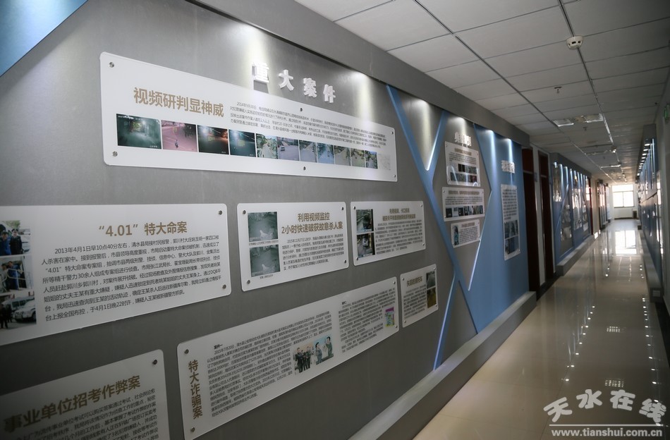 清水縣公安局警營文化長廊的設(shè)計形式簡潔大氣、內(nèi)容設(shè)計具體、版面立意準(zhǔn)確、圖片傳神、文字凝練深刻。全長370多米約1000平方米的警營文化長廊,由浮雕、木雕、卷軸、畫像、圖片、文字、書畫作品等不同元素組成,在不同的樓層,以不同的主題,分別展現(xiàn)了公安工作的發(fā)展演變史,全景式展現(xiàn)了清水公安各個歷史階段,各個職能部門的發(fā)展變化。同時以從嚴(yán)治警、從優(yōu)待警、文化育警為主題,通過歷史文化和警令紀(jì)律的結(jié)合,為執(zhí)法行為畫上紅線;以黨建、警史、榮譽(yù)為主題,通過規(guī)范規(guī)章制度、選樹先進(jìn)典型,為今后的發(fā)展明確思路和目標(biāo)。